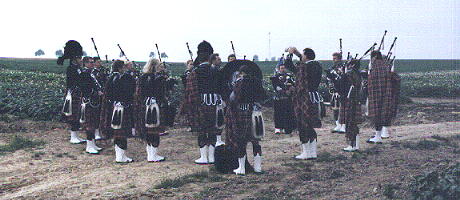 At a juction between two farm tracks, just outside the village, the United Mineworkers' Federation of Australia Pipe Band was warming up, and they made an unusually picturesque scene - Australians dressed in Scottish uniform, playing among the fields of Northern France.