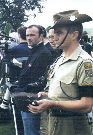 | On this morning, the cemetery was a busy place, as a couple of hundred people waited for the funeral to begin. There were lots of Australians, of course, but there were also French and English voices, plus at least two American soldiers. Apart from one section of the cemetery, reserved for press and TV, there was no restriction on where visitors might stand and we stood to the side of the prepared grave, where we waited for the ceremony to begin. |
