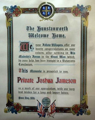 Four Jameson brothers, Michael, Makepeace, Joshua and William, together with Arthur John Taylor, all fought in the 1914-18 war and returned to their community.safe and sound. They were each presented with a framed certificate of thanks from the people of Hunstanworth for Peace Day in 1919, which wished them all a "long and happy future."