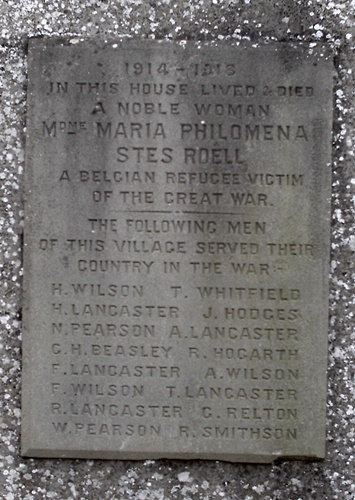 It also mentions Madame Maria Philomena Stes Roell, a Belgian refugee, who lived "in this house". Mme. Roell must have made quite an impression on the village to be named as "a noble woman" on the village war memorial, which was placed on the wall of the house in which she lived. On our behalf, Mary Moseley, Secretary of the Ripon and District Historical Society, checked the local parish registers and found that there is a record of a funeral at nearby Cundall:-