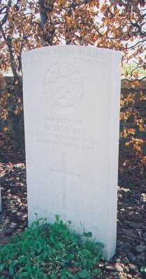 |  The grave of Pte. Walter Heames of the 1/5th North Staffords in St Mary's ADS Cemetery | The bodies of more men of the Staffordshire Brigade can be found buried in the St Mary's ADS Cemetery, on the side of the D39 Hulluch to Vermelles Road, close the village of Hainse. The cemetery was formed after the Armistice, by the concentration of graves from the battlefield of Loos; the great majority of the graves are those of men who fell in September and October 1915. There are now nearly 2,000 casualties from the Great War buried or commemorated in this cemetery. Of these, over two-thirds are unidentified. At the rear of the cemetery is a row of eleven Special Memorial headstones commemorating soldiers from the 1/5th and 1/6th North Staffords who are believed to have been buried in the cemetery. Among these are 1719 Lance-Corporal Fred Mallett of the 1/6th North Staffords, (Row B, Grave 2) and 401 Private William Heames, of the 1/5th North Staffords, (Row B, Grave 7). According to his obituary in the "Staffordshire Weekly Sentinel", William Heames had the longest continuous service of any private soldier within the battalion. Other soldiers, whose bodies were recovered after the war, can be found buried at Cabaret-Rouge British Military Cemetery, the Canadian Cemetery at Neuville St Vaast, and Bully-Grenay Communal Cemetery Extension. |