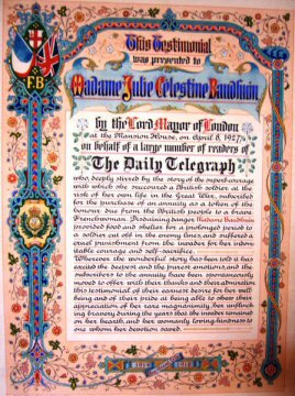 This Testimonial by the Lord Mayor of London at the Mansion House, on April 8, 1927 on behalf of a large number of readers of The Daily Telegraph who deeply stirred by the story of the superb courage with which she succoured a British soldier at the risk of her own life in the Great War, subscribed for the purchase of annuity as a token of the honour due from the British people to a brave Frenchwoman. Disdaining danger Madam Baudhuin provided food and shelter for a prolonged period to a soldier cut off in the enemy lines, and suffered a cruel punishment from the invader for her courage and self-sacrifice. Wherever the wonderful story has been told it has excited the deepest and the purest emotions, and the subscribers to the annuity have been spontaneously moved to offer with their thanks and their admiration this testimonial of their earnest desire for her well-being and of their pride at being able to shew their appreciation of her rare magnanimity, her unflinching bravery during the years that the invader remained on her hearth, and her womanly loving-kindness to one whom her devotion saved. 1914 The Great War 1918 |