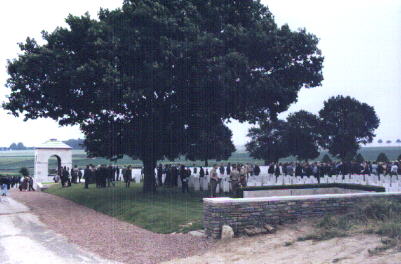Then there were floral tributes and the last part of the ceremony. Eighteen members of the Regiment fired volleys and the bugler sounded "Last Post" followed by "Reveille" after a period of silence, during which I looked up from the grave-site and saw the site of Pozieres windmill - the object of the attack in which Russell was killed - on the skyline at the highest point of the road from Bapaume to Albert. |