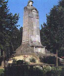 From Lachalade we drove eastwards to a minor road, the D38c, which is better known as the Haute Chevauchee. On the Haute Chevauchee is the main memorial within the forest: the Memorial to the Defenders of the Argonne. It was inaugurated by Poincare on 30 July 1922 and commemorates 150,000 French combatants. The nine metre high stone monument is surmounted by the bust of a poilu whose hands are clasping the handle of a sword which overlays a cross. The flanks of the monument are engraved with the numbers of 275 French regiments, 18 Italian regiments, and 32 American divisions which saw service in the Argonne sector. The crypt of the memorial contains an ossuary which contains the remains of several thousand unknown soldiers. |