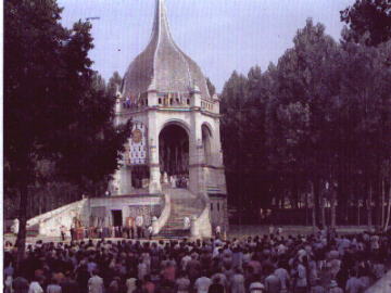 One of the main Great War sites in Brittany is at St. Anne d'Auray. This small sombre town in south Brittany is a major religious site, and is centred around an abbey. It is a centre of pilgrimage, and the Pope himself gave a mass there one week after my visit. The town is home to the Breton Monument aux Morts which commemorates the 240,000 Breton dead of the Great War. In concept it is not dissimilar to that of the Scottish War Memorial in Edinburgh Castle. The memorial consists of a large octagonal structure in which a high pointed roof covers a large altar. Below this is a crypt which contains five small altars, one for each of the five dioceses in Brittany. |