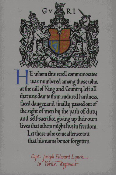 On the outbreak of the First World War the temptation to rejoin the army proved too much for Lynch, he offered his services and in September 1914 he was appointed to the 10th Battalion of the Yorkshire Regiment as one of their first officers. Lynch was promoted on the 3rd of April 1915 from Lieutenant to Captain, and finally on the 9th of September of the same year the battalion left Witley Camp for France, they marched to Milford and from there a train to Folkstone, reaching Boulogne in the early hours of the 10th. The regimental history records Lynch as being one of the first officers of D Company on arriving in France, it also goes into detail about the battalions first action of the war in which Lynch was to be killed. The following passage is taken from the regimental history.