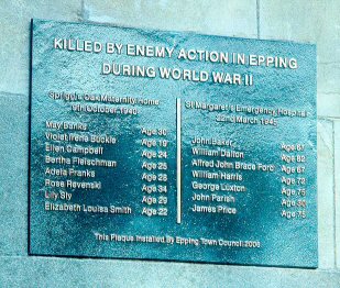 In November 2006 Epping's first memorial to civilian war dead was unveiled. This commemorates those killed in two incidents in World War II. The first occurred on October 9th 1940, when a bomb fell on Spriggs Oak, a large house in Palmers Hill which was being used to house pregnant women from the east end of London. Six of them, the youngest of whom was just 19, died in the house and two more later in St Margaret's Hospital. The second incident took place on 22nd March 1945. A V2 Rocket struck the water tower in Fairfield Road, and the resulting explosion killed seven men in St Margaret's Hospital.