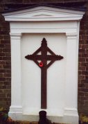 Another memorial at the Congregational Church was unveiled in 1923. This was the original graveyard cross of Gerald Church, son of local butcher Stephen Church. He was killed in action in France in 1917 and was buried in the village of Villers-Faucon. The crosses used to mark the graves of British and Commonwealth war dead were eventually replaced by the white headstones of the Commonwealth War Graves Commission. Many relatives arranged to have the crosses brought home, and Gerald's family were among them. The cross is still in position today.