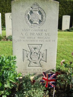 It is the final resting place of Corporal Alfred Drake VC of 8th Bn. Rifle Brigade, born in December 1893. On 23 November 1915, near the hamlet of La Brique, Corporal Drake was one of a patrol of four which was reconnoitring towards the German lines. The patrol was discovered when close to the enemy who opened fire with rifles and machine gun, wounding the officer and one of the men. The latter was carried back by the last remaining man and Corporal Drake stayed with his officer, bandaging his wounds regardless of the enemy's fire. Later, a rescue party found the officer, alive and bandaged, but the corporal was dead. An extract from "The London Gazette," No. 29447, dated 21 January 1916, records the following:- "For most conspicuous bravery on the night of 23rd Nov., 1915, near La Brique, France. |