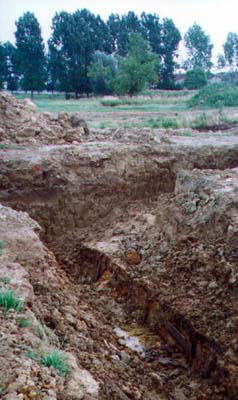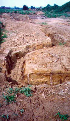 Credit for the opening-out of the dugout and communication trench back in 1992, goes to a small group of enthusiastic Belgians calling themselves the Diggers. This voluntary group of five, spearheaded by Johan Vandewalle, working under a special license from the Flemish Regional Authorities, keep ahead of the concrete pourers, attempting to locate, uncover and record such reminders of the Great War. The grant allocated by the authorities to fund their work would be grossly exaggerated if described as 'peanuts', and they have been told to augment this already long-spent sum by selling anything they find. A sad and sorry set of conditions under which to work. Nevertheless they are busy again, attempting to uncover more of the trench as the building teams move ever closer. |
