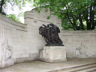 | More of Sir Reginald Bloomfield's work (sculptures by Victor Rousseau this time) can be seen just along the Victoria Embankment and across from Cleopatra's Needle. Set back from the pavement and in its own Portland Stone surround, the subject this time is a Belgian women accompanied by a boy and girl carrying garlands. And the commemoration, well once again the inscription tells all: 'To the British Nation from the grateful people of Belgium, 1914-1918'. | ![]() |