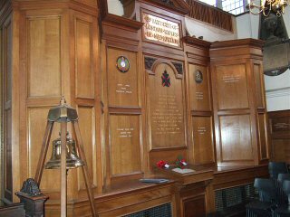 Another regiment to be remembered at St Sepulchre's is the 6th London Regiment. Formed in the City of London in 1860 and for many years known, due to its association with the newspaper and printing industry, as the 'Printers Battalion'. At the west end of the church wood panelling serves as its memorial and close by a battered wooden cross is another reminder of fine service. For this relic once stood, until it was replaced in February 1919 by a more permanent memorial, on the battlefield at Loos where it marked the graves of almost one hundred officers and men from the regiment that fell there on 25th September 1915.